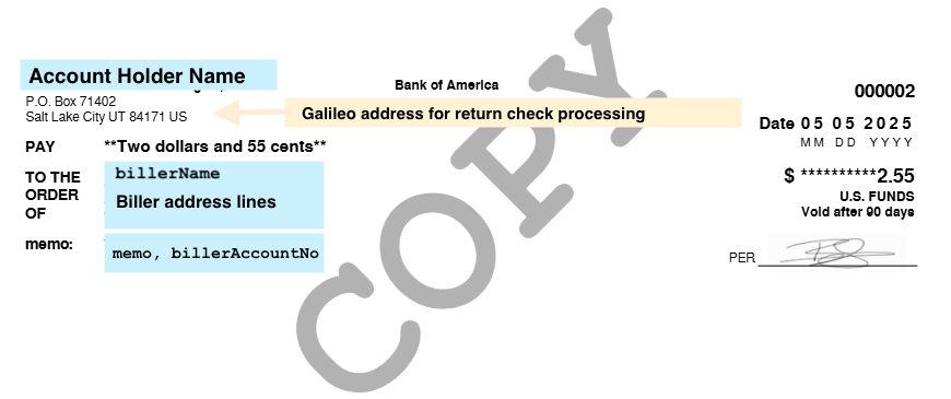 A check can be returned to Galileo either by the post office (bad address), by the biller, or by the biller's bank, and the timing of the return depends on post office handling, the decision of the biller, or the bank's processing schedule. (Galileo cannot tell you why the bank returned a check; you must ask the bank for that information.) When Galileo receives a returned check—or when a check expires—it takes approximately 1–3 days to return the amount to the account.