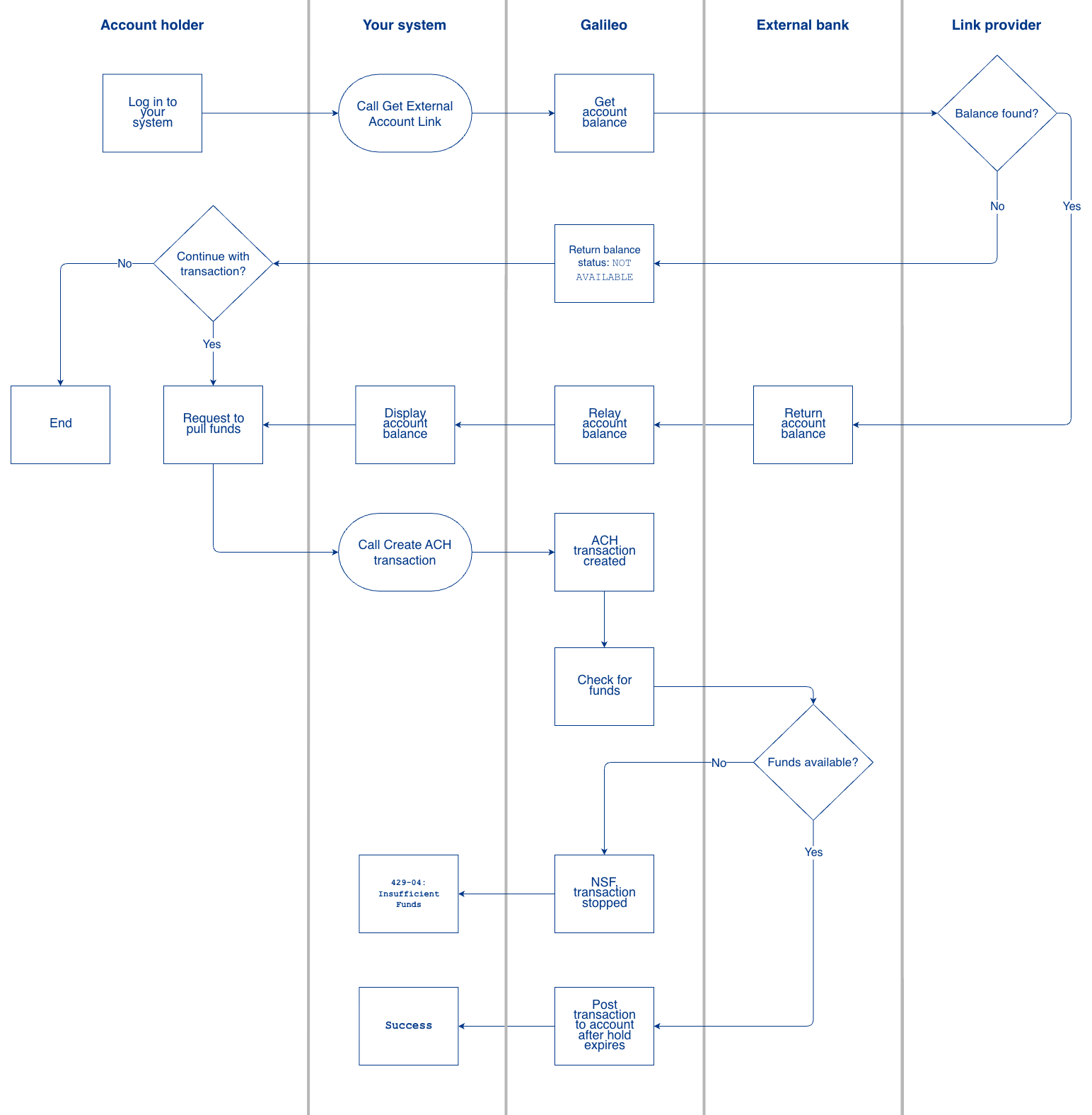 - If you are currently using Galileo for ACH, you will need to work with Galileo to have your system call the new account linking endpoints instead of ACH endpoints. Balance Check is not available on legacy ACH endpoints.