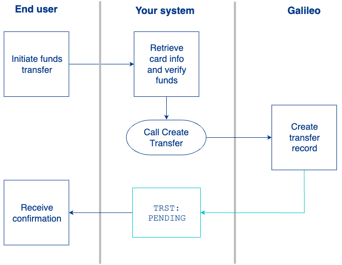 During the funds transfer process, Galileo sends the TRST: transfer_status_change event any time the status of the transfer changes. Galileo first triggers this event when the transfer status transitions to a new state, such as when a pending transfer completes, fails, or is canceled.