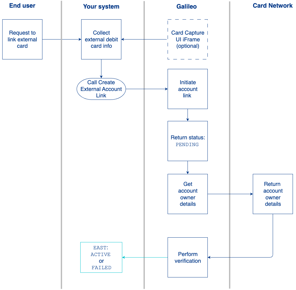 externalAccountLinkId. At this stage, the bank account link is pending because it is awaiting verification. - Galileo requests the account owner details from the card network to confirm the account holder's identity.