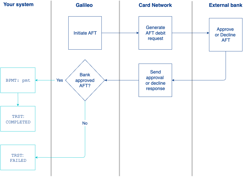 - The external bank approves or rejects the AFT and sends the response back to the card network.