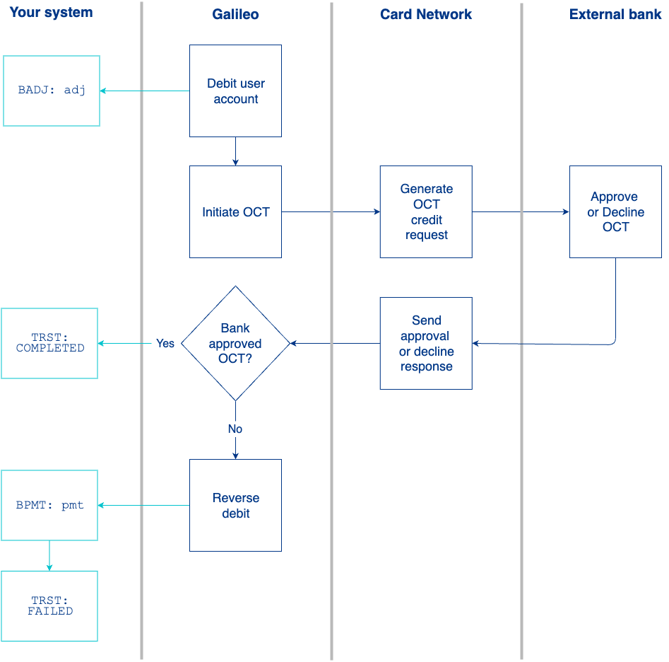 BADJ: adjevent message. - Galileo initiates an OCT by sending a payment authorization request to the card network.