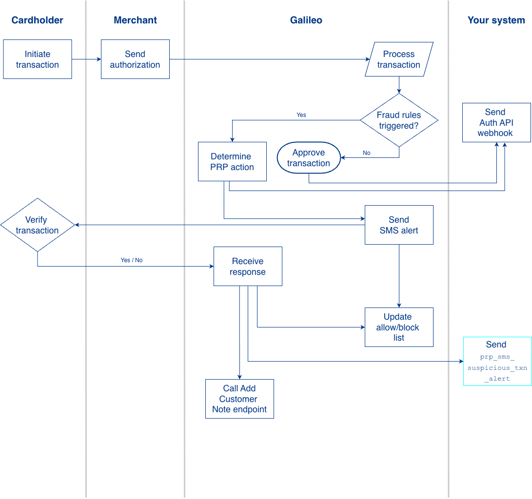 - Galileo sends the PRP SMS Suspicious Transaction Alert event to your system via the Events API.